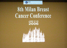 2006年7月21日〜23日にイタリア、ミラノで開催された、8th Milan Breast Conference(第8回ミラノブレストカンファレンス)に参加しました。 European Institute of Oncology(EIO)を代表する、ベロネージ先生:乳腺外科医(Umberto Veronesi M.D.)とゴールドヒルシュ先生:腫瘍内科医(Aaron Goldhirsch M.D.)のお二人が主任座長でした。ベロネージ先生は、現役で手術を行っており、厚生大臣のご経験もあるため、イタリア国内の医療問題のコメンテーターとして必ず欠かせない人物です。一般市民で知らない人はいないとのことでした。日本の日野原先生のような存在でしょうか。また、講演者の中には、今年10月15日に国際シンポジウムに参加いただくページ先生:病理医(David L. Page M.D.)もおられ、他にも多数の著名な先生がたが来伊されておりました。